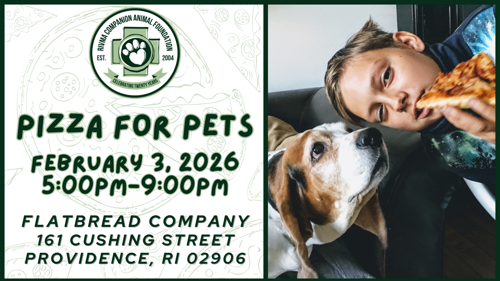 On Tuesday, November 14th, enjoy delicious pizza to benefit a great cause – the RIVMA Companion Animal Foundation (CAF)!